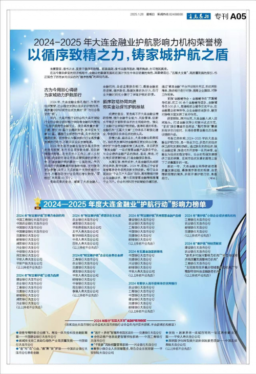 1月26日,由《半岛晨报》主办的“以循序致精之力,铸家城护航之盾”2024-2025年大连金融业护航影响力机构荣誉榜隆重发布,对在服务“五篇大文章”、践行高质量发展中做出重要贡献的滨城金融机构进行表彰,平安养老险大连分公司荣耀上榜,获评2024年“财富新护航”卓越企业文化奖。